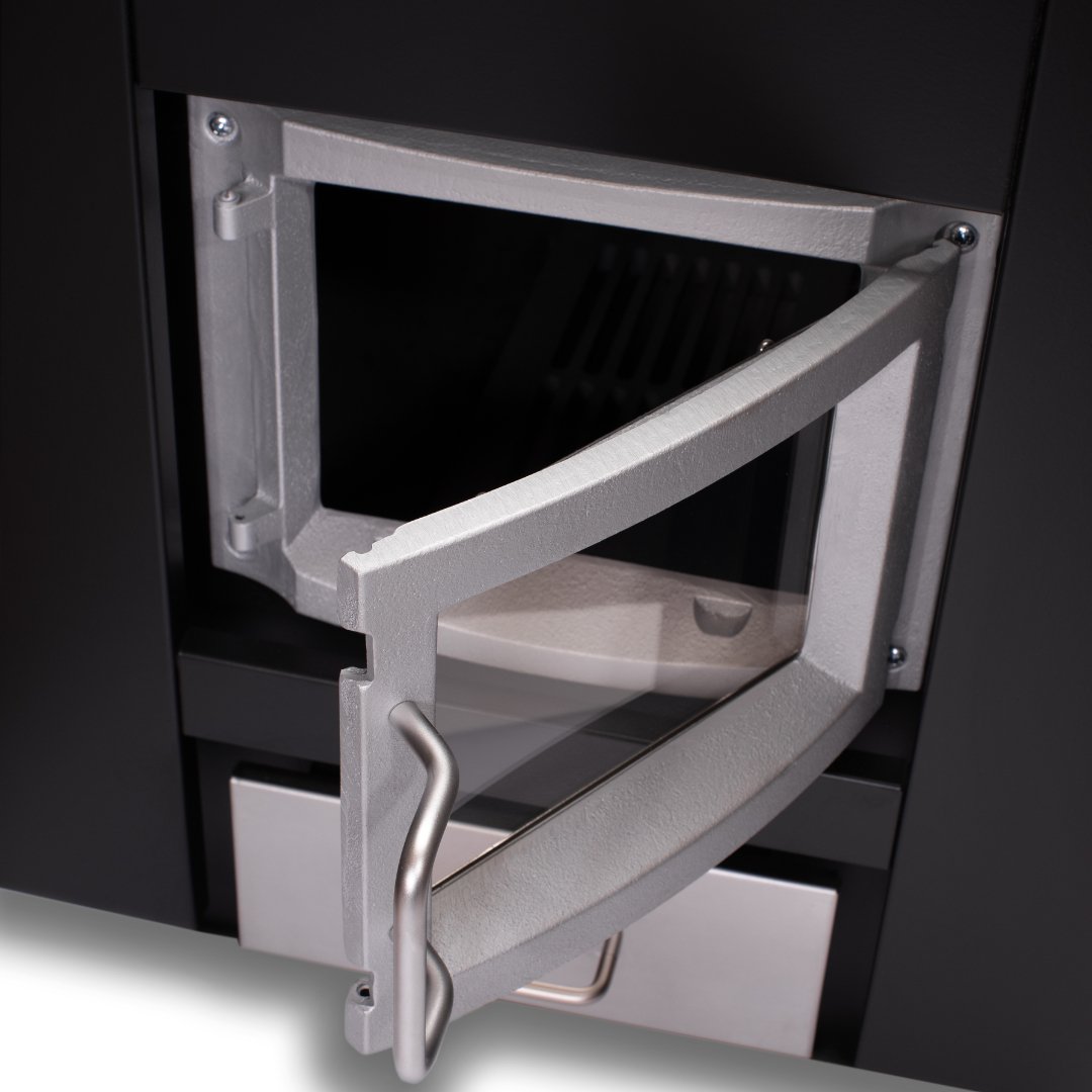 - The glazed hatch ensures an even flame distribution within the heater whilst also creating a pleasing cosy atmosphere. The wooden handles and cast iron latch twin perfectly, both comfort and durability, and are vital for ensuring personal safety and pleasantly cool handling during use.